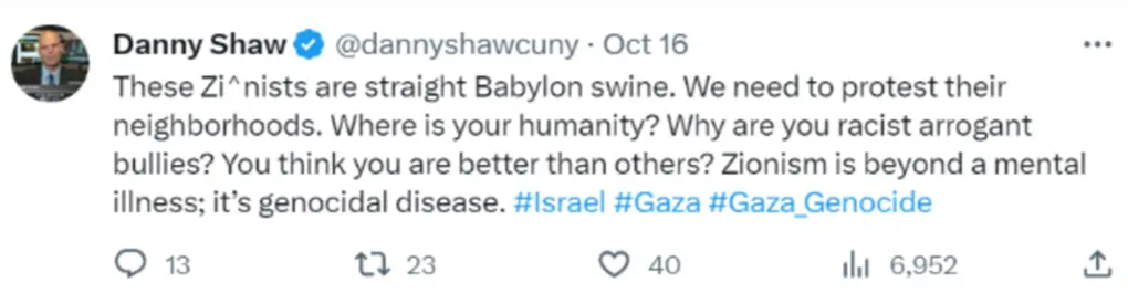 Danny Shaw, Adjunct Lecturer of Latin American and Caribbean Studies and Race, Ethnicity, Class and Gender at the City University of New York, posted on his X account on October 16, 2023. Danny Shaw, Adjunct Lecturer of Latin American and Caribbean Studies and Race, Ethnicity, Class and Gender at the City University of New York, posted on his X account on October 16, 2023.