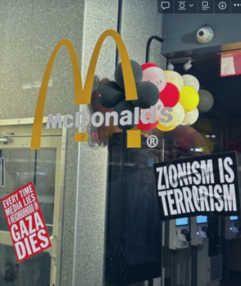 - Etiquetas colocadas en un McDonald’s de Manhattan, diciembre de 2023. Desde el 7 de octubre, estas etiquetas han sido colocadas en muchos lugares de todo el país.