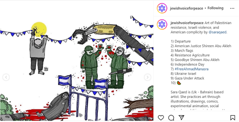 - El 26 de mayo de 2022, Jewish Voice for Peace publicó el siguiente meme en Instagram: