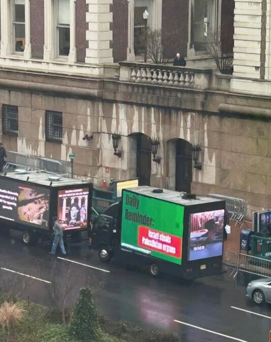 - Camión con el texto “Recordatorio diario: Israel roba órganos palestinos”, visto frente a la Universidad de Columbia en febrero de 2024.